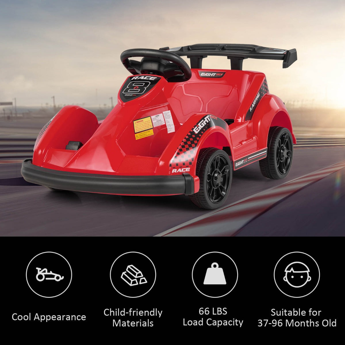 Offers Realistic Driving Experience: With a built-in 6V battery and strong motor, our kid's go-cart guarantees a safe speed of 2 mph to offer kids an unforgettable riding experience. 4 durable and wear-resistant wheels make the car suitable for different road conditions, such as the wood floor, cement road, brick road and more.