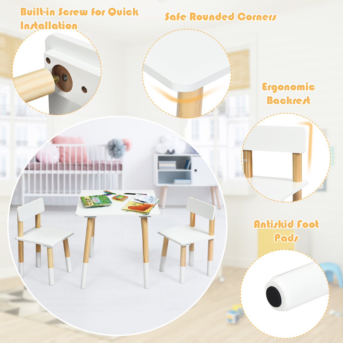 Sturdy & Safe Materials: Constructed by natural pine wood legs and MDF board, the table and chairs set is sturdy and durable for a long lifespan. Solid support legs ensure good stability and strong load-bearing capacity. Besides, it has no burr and will not hurt your kids' skin.
